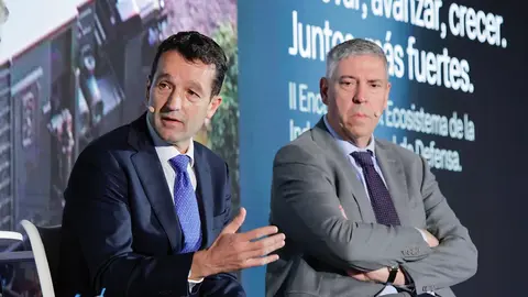 El presidente ejecutivo de Indra Group, Ángel Escribano, y Luis Corral, CEO de Piedrafita Systems, firmaron este acuerdo estratégico durante el II Encuentro del Ecosistema de la Industria Nacional de Defensa, organizado por Indra Group.