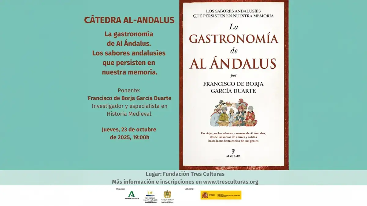 La Fondation des trois cultures de la Méditerranée a programmé pour le jeudi 23 octobre prochain une nouvelle conférence dans le cadre de sa série Cátedra al-Andalus, intitulée « La gastronomie d'Al-Andalus. Les saveurs andalouses qui persistent dans notre mémoire ». La conférence sera donnée par Francisco de Borja García Duarte, expert reconnu en histoire médiévale et auteur du livre du même nom.