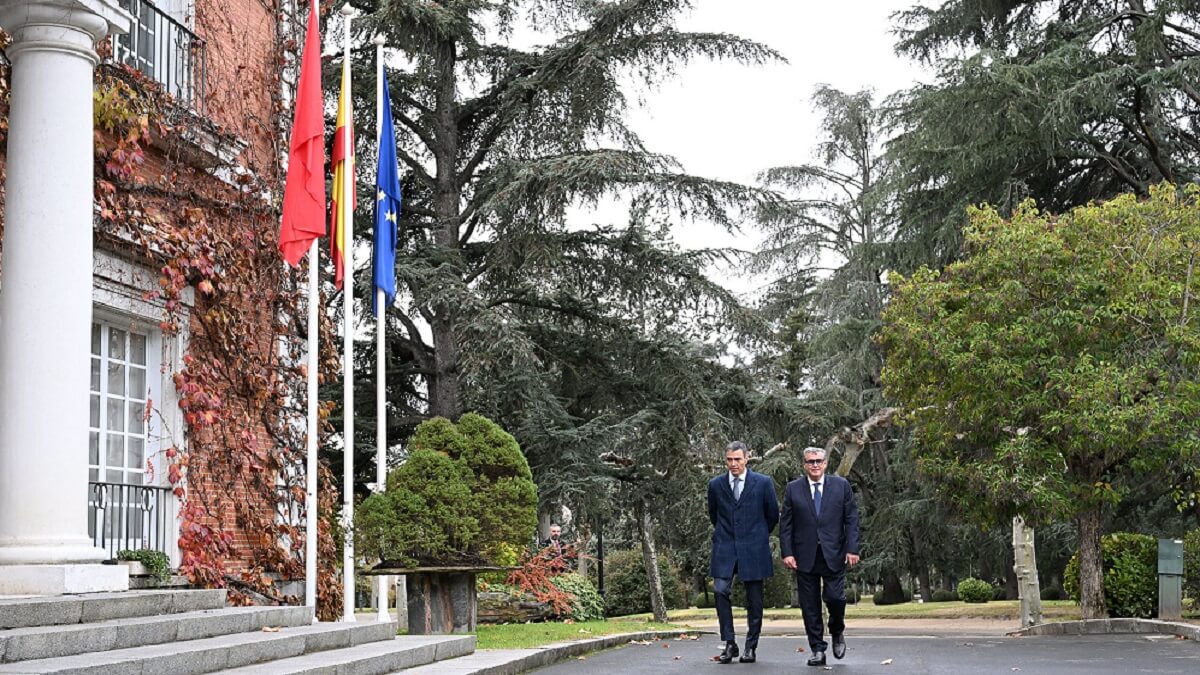 El presidente del Gobierno, Pedro Sánchez, y el jefe del Gobierno del Reino de Marruecos, Aziz Akhannouch, en la entrada del Palacio de La Moncloa - PHOTO/Pool Moncloa/Borja Puig de la Bellacasa